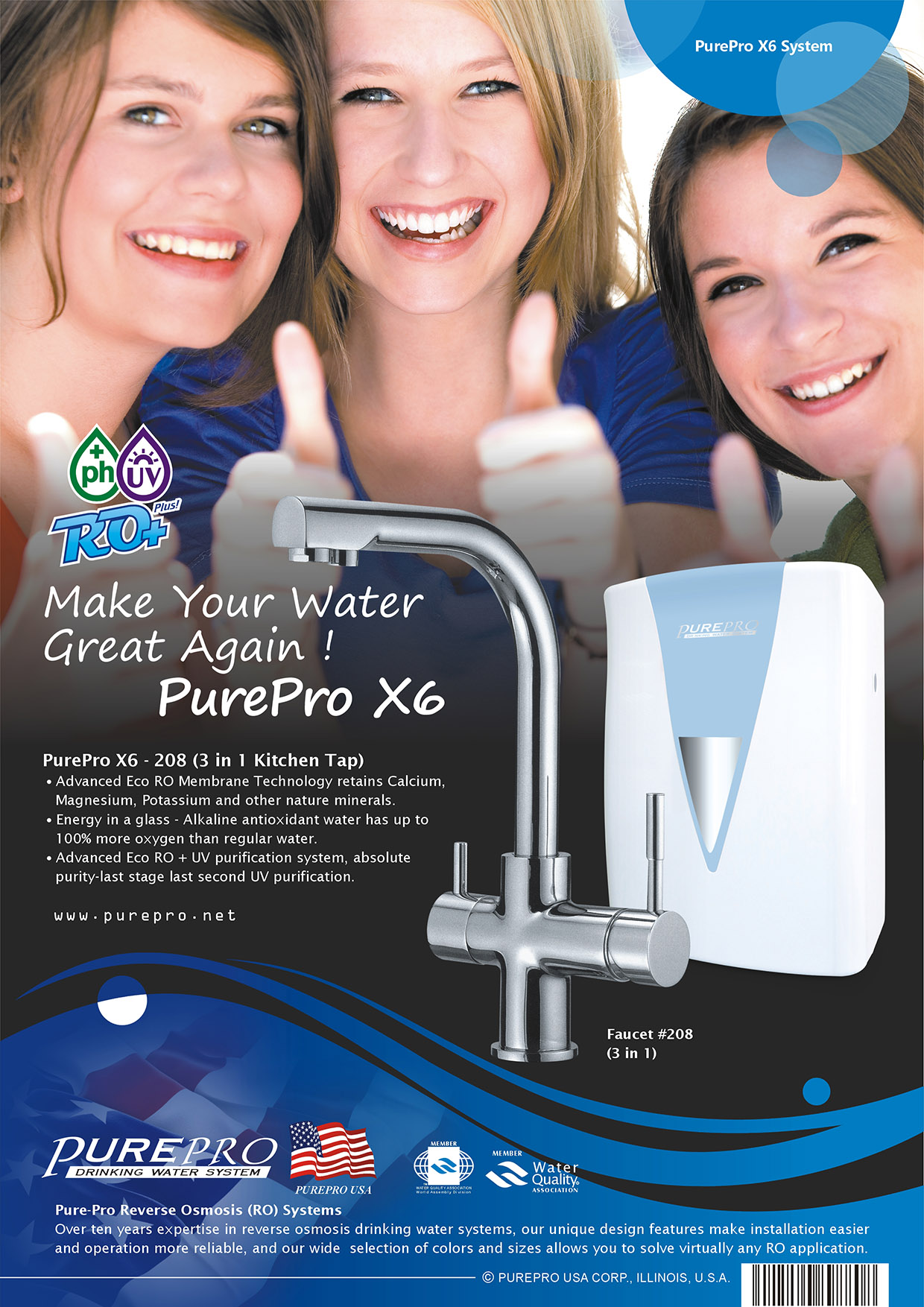 美國 PurePro® X6-208 紫外線鹼性RO活水機-搭配RO三用龍頭.質感設計.品味彰顯